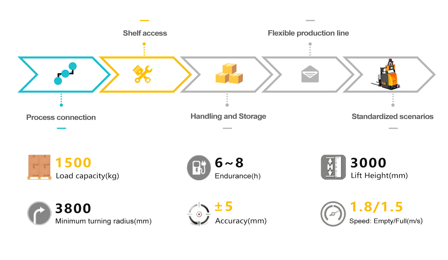 The M15C balanced weight stacking forklift AGV adopts laser SLAM navigation and is designed specifically for automated material handling and stacking in industrial scenarios. It is compatible with double-sided pallets, has a large load capacity, lifting capability, and high precision. It is suitable for material handling, line docking, and warehouse docking scenarios in photovoltaic, mechanical manufacturing, precision manufacturing, textile, food, and other industries.