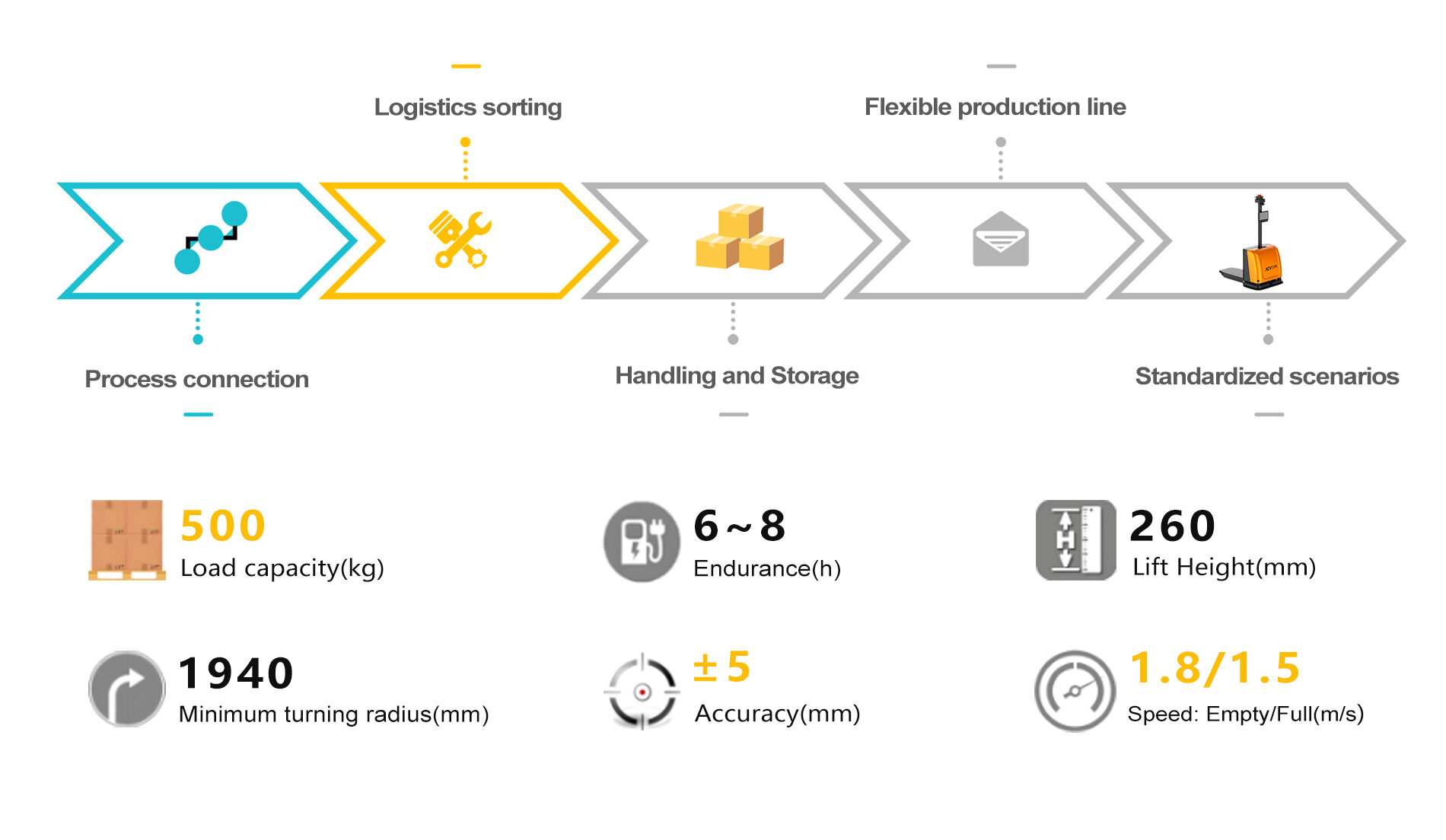 ‘MicroTitan' V050T flat handling forklift AGV adopts laser SLAM navigation and is equipped with 3D stereo vision obstacle avoidance. The vehicle has a small volume, high flexibility, and can travel in all directions. It has a strong ability to pass through extremely narrow spaces with a load of 500kg. It is suitable for use in small space material handling scenarios such as supermarkets and warehouses.