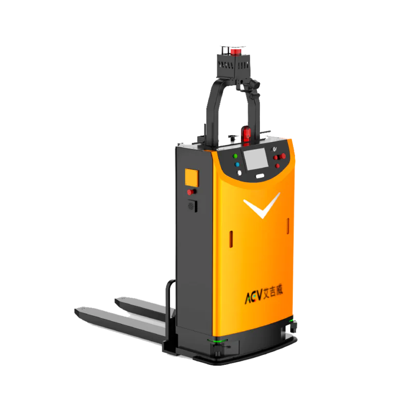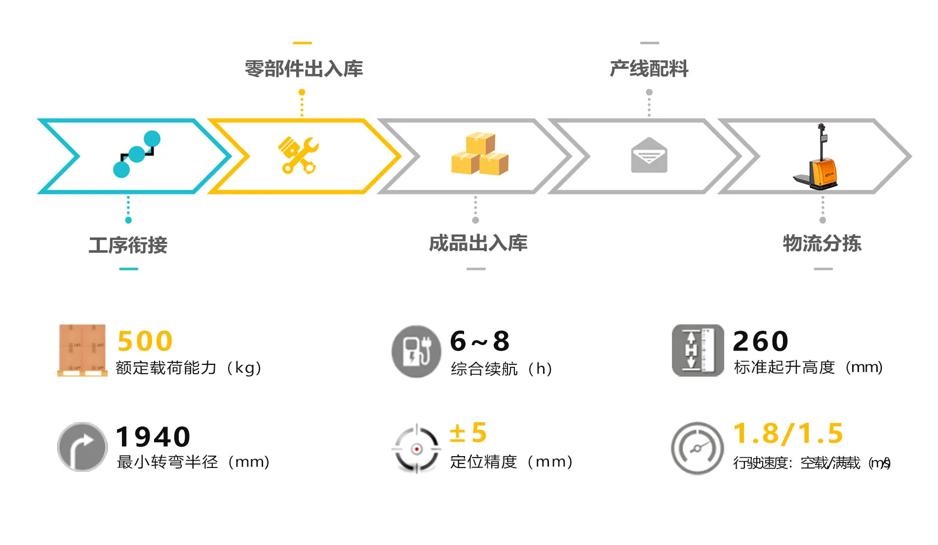 ‘小千斤’V050T平面搬运式叉车AGV,采用激光SLAM导航,配备3D立体视觉避障。整车体积小、灵活性高,可全向行走,极窄通过能力强,负载500kg。适合在商超、仓库等狭小空间物料搬运场景使用。